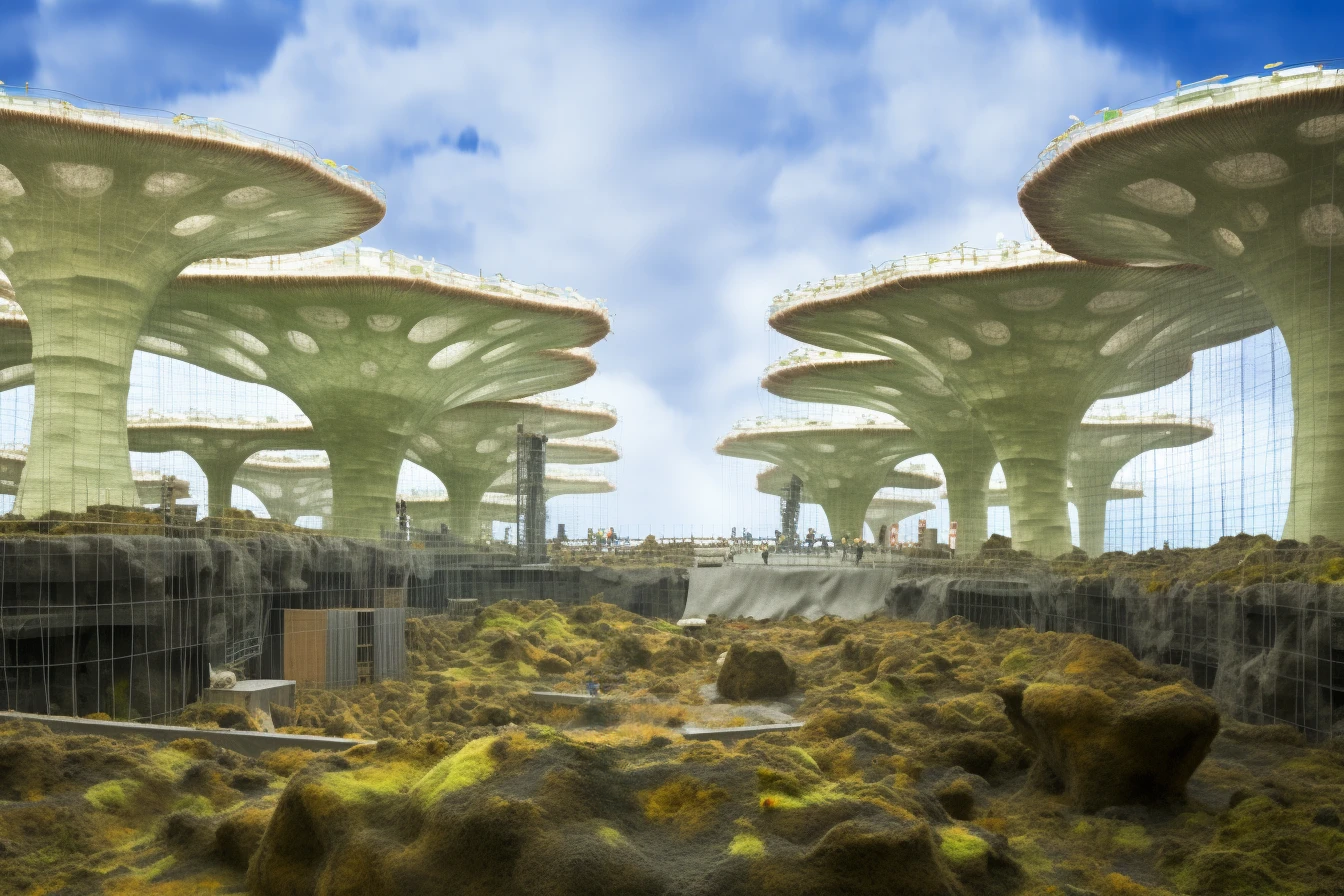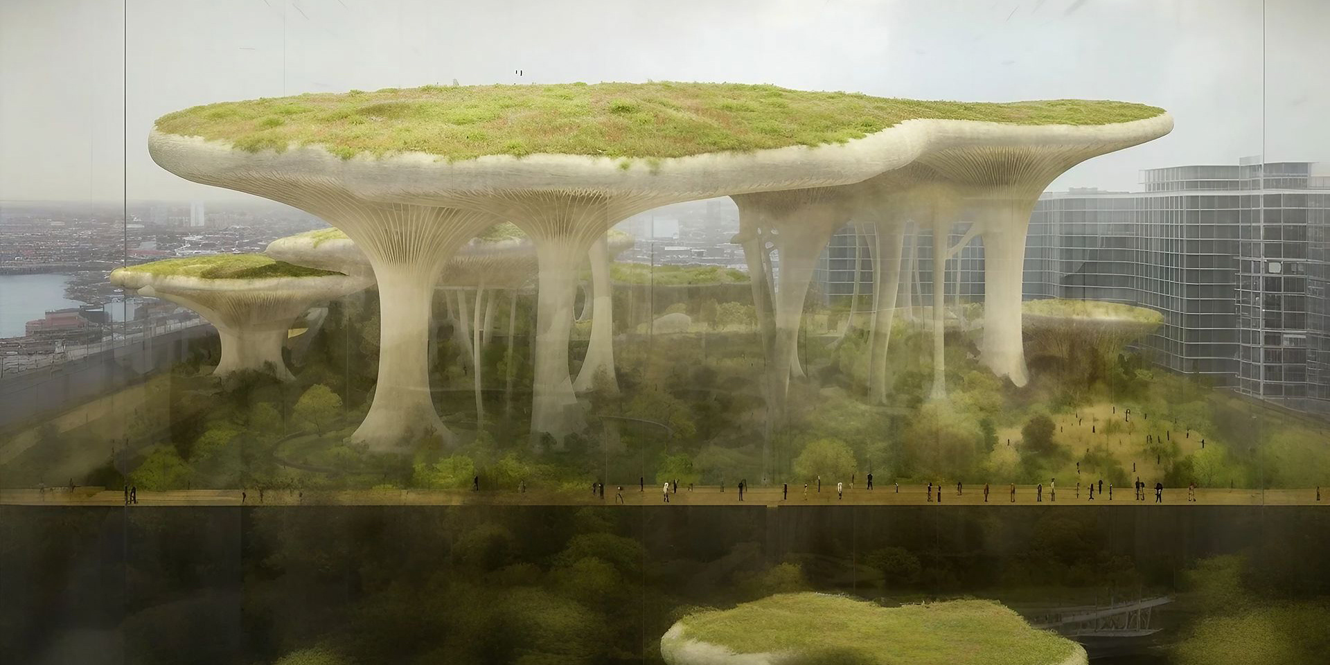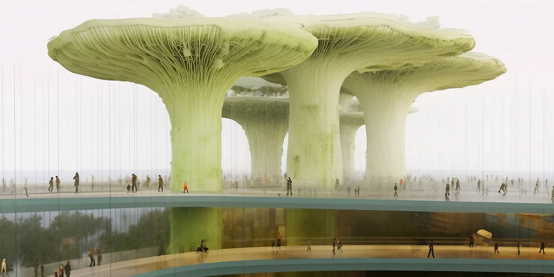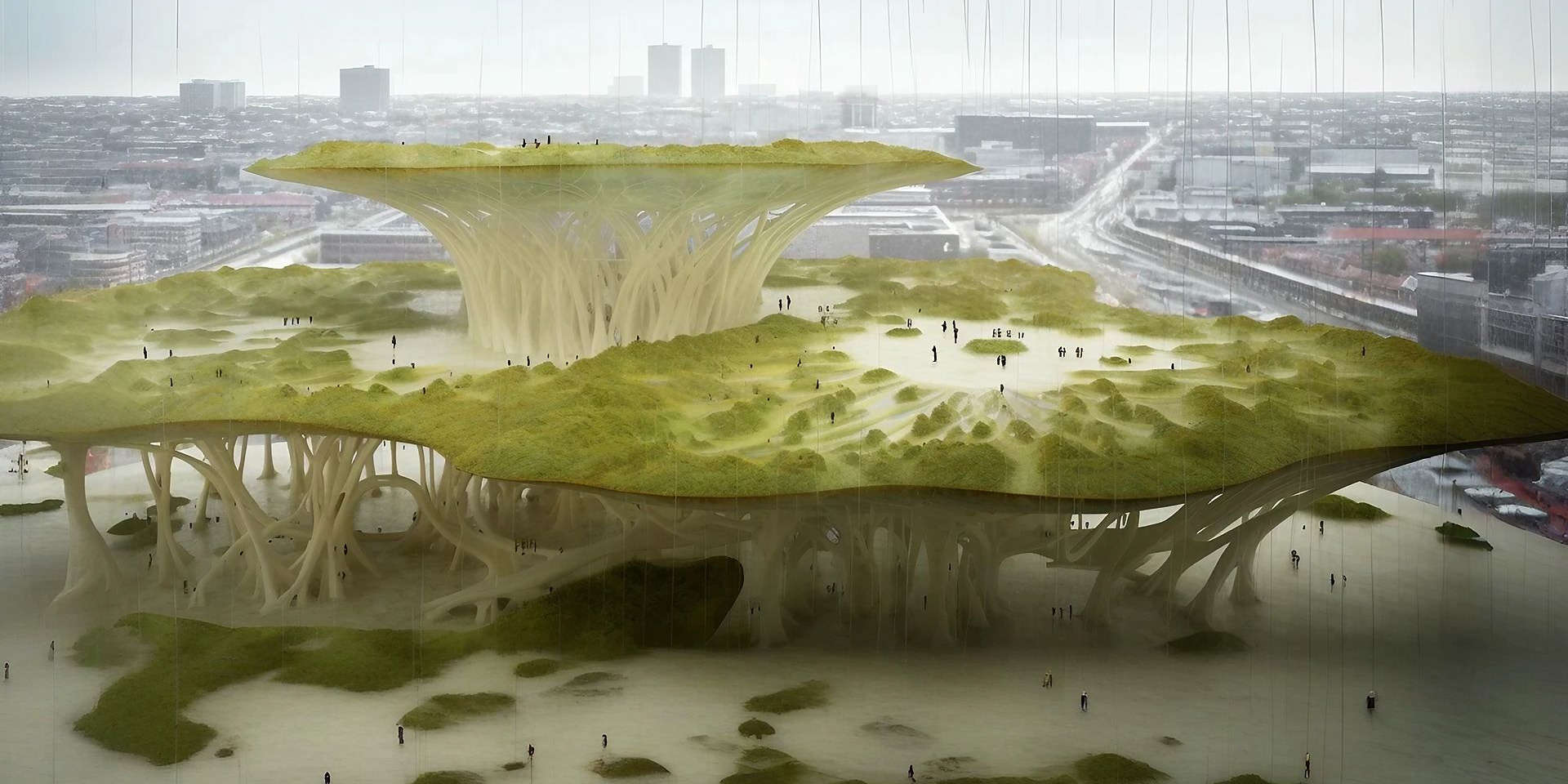 MYCORRHIZA REFERS TO A PARTICULAR TYPE OF SYMBIOTIC ASSOCIATION BETWEEN A FUNGUS AND A HIGHER PLANT, LOCATED WITHIN THE ROOT SYSTEM OF THE SYMBIONT PLANT, AND WHICH EXTENDS, BY MEANS OF HYPHAE OR MORE COMPLEX STRUCTURES SUCH AS RHIZOMORPHS, INTO THE RHIZOSPHERE AND THE SURROUNDING SOIL. AS MERLIN SHELDRAKE RECOUNTS, IN THE BOOK ENTANGLED LIFE: HOW FUNGI MAKE OUR WORLDS, CHANGE OUR MINDS & SHAPE OUR FUTURES, ABOUT 500 MILLION YEARS AGO “MYCORRHIZAL RELATIONSHIPS EVOLVED TO MEET THE CHALLENGES OF A DESOLATE, WEATHERED WORLD AT THE DAWN OF LIFE ON EARTH.” "BY FORMING NEW RELATIONSHIPS WITH FUNGI, THE ALGAE MANAGED TO REACH LAND. THESE EARLY ALLIANCES EVOLVED INTO WHAT WE CALL "MYCORRHIZAL RELATIONSHIPS." THE ORGANISMS WE CALL "PLANTS" ARE ACTUALLY FUNGI THAT EVOLVED TO RAISE ALGAE, AND ALGAE THAT EVOLVED TO RAISE FUNGI." “TODAY, MORE THAN NINETY PERCENT OF PLANT SPECIES DEPEND ON MYCORRHIZAL FUNGI.” “GLOBALLY, THE LENGTH OF MYCORRHIZAL HYPHAE IN THE TOP TEN CENTIMETERS OF SOIL IS APPROXIMATELY HALF THE WIDTH OF OUR GALAXY (4.5 X 1017 KILOMETERS OF HYPHAE VERSUS 9.5 X 1017 KILOMETERS OF SPACE). IF THE HYPHAE WERE STRETCHED AND FLATTENED, THEIR SURFACE WOULD COVER EVERY CENTIMETER OF THE EMERGED LAND OF OUR PLANET TWO AND A HALF TIMES. MYCORRHIZAL HYPHAE DIE AND REGROW SO RAPIDLY – BETWEEN TEN AND SIXTY TIMES A YEAR – THAT IN A MILLION YEARS THEIR OVERALL LENGTH WOULD EXCEED THE DIAMETER OF THE KNOWN UNIVERSE (4.8 X 1010 LIGHT YEARS OF HYPHAE VERSUS 9, 1 X 109 LIGHT YEARS OF THE KNOWN UNIVERSE)” “THESE ORGANISMS HAVE ALWAYS SURVIVED ENVIRONMENTAL DEVASTATION AND THE ABILITY TO WITHSTAND PERIODS OF CATASTROPHIC CHANGES – DURING WHICH, INDEED, THEY OFTEN FIND THEMSELVES THRIVING – IS ONE OF THEIR MAIN CHARACTERISTICS. MUSHROOMS ARE CREATIVE, FLEXIBLE AND COLLABORATIVE. NOW THAT MUCH OF EARTH'S LIFE IS THREATENED BY HUMAN ACTIVITIES, COULD WE PARTNER WITH FUNGI AND ASK FOR THEIR HELP IN ADAPTING TO THESE NEW CONDITIONS?” FOLLOWING THE SUGGESTION OF THE QUESTION POSED BY MERLIN SHELDRAKE, THE IMAGES OF THE MICOCITY SERIES SHOW US THE MOMENT IN WHICH IN A FUTURE EVOLUTIONARY LINE OF OUR SPECIES A NEW SYMBIOTIC ALLIANCE BEGINS TO DEVELOP BETWEEN MAN AND GIGANTIC MYCORRHIZAL HYPHAE CAPABLE OF SUPPORTING AND NOURISHING A NEW URBAN ECOSYSTEM, IN WHICH BUILDINGS AND INFRASTRUCTURE ARE INTEGRATED INTO A LIVING SYSTEM THAT BREATHES, GROWS AND REGENERATES IN AN ATTEMPT TO COUNTERACT THE DAMAGE CAUSED BY HUMAN ACTIVITY AND CREATE A RESILIENT AND SUSTAINABLE ENVIRONMENT.